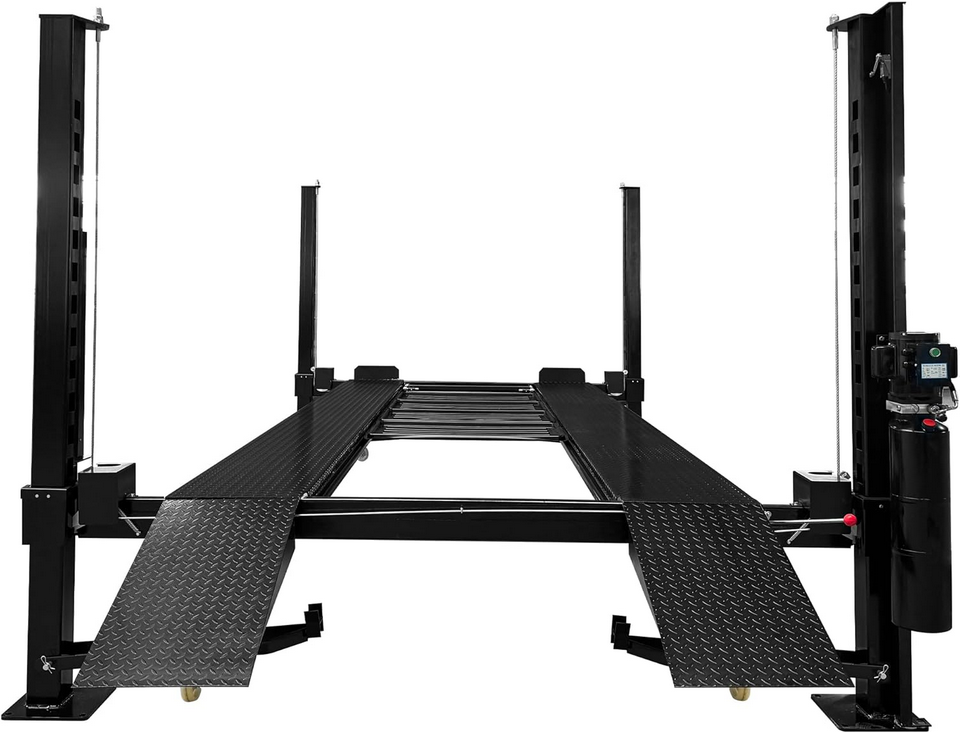 APlusLift HW-4P11S 4-post car auto lift truck hoist package includes a caster kit with polyurethane wheels, a jack tray, and two removable approach ramps. The caster kit allows customers to move the lift around the garage easily and can be installed or removed in minutes. The jack tray allows customers to use a jack to lift one end of the vehicle. The drip trays(Optional) prevent fluid from the top vehicle from dripping onto the bottom vehicle. Optional sliding jacks and drip trays are available for purchase.