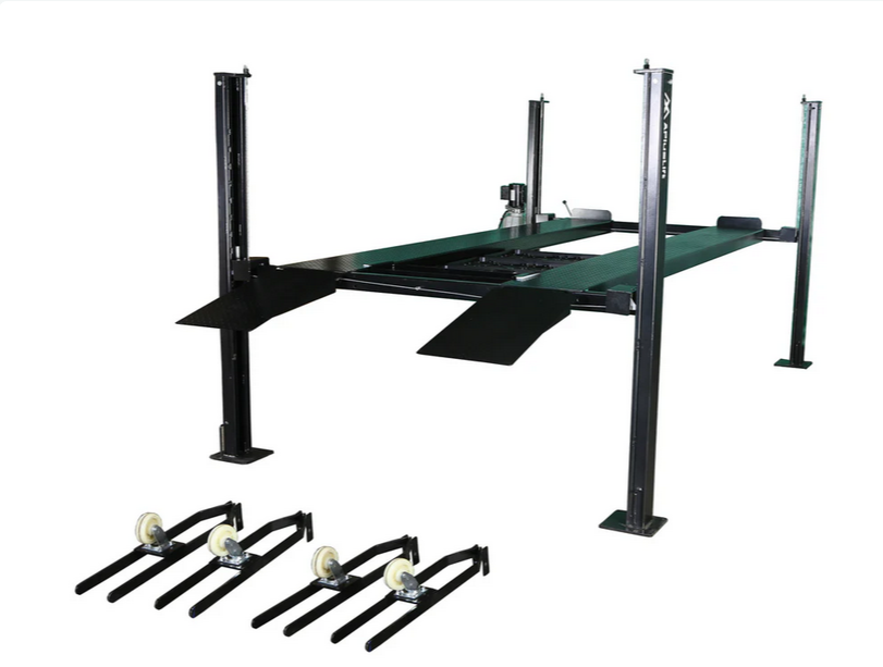 APlusLift HW-8S and HW-8SXLT 4-post car lift (auto hoist) package includes a caster kit with polyurethane wheels, a jack tray, three drip trays, two removable approach ramps and a power cord. The caster kit allows customers to move the lift around the garage easily and can be installed or removed in minutes. The jack tray allows customers to use a jack to lift one end of the vehicle. The drip trays prevent fluid from the top vehicle from dripping onto the bottom vehicle. Optional sliding jacks are available for purchase.