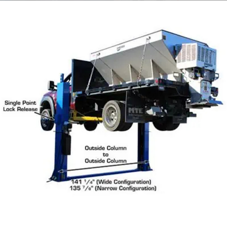 The Atlas® BP12000X is a commercial grade heavy duty 12,000 LB. capacity 2 post base plate above ground lift. This above ground lift has over sized columns, symmetric three stage arms, and single point lock release. This lift is perfect for those commercial garages that want to lift heavier vehicles but have limited ceiling height. The Atlas® BP12000X can be installed at two different width settings to accommodate wider trucks or trailers and to facilitate “driving between” the lift columns.